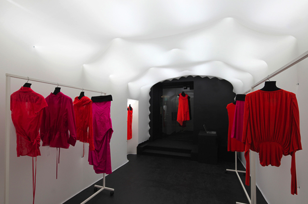 La tienda, que se encuentra ubicada en un antiguo edificio en el norte de la ciudad, tiene sus paredes cubiertas con una suave tela blanca que revela el contorno de un techo abovedado sobre el que se ha ocultado la iluminación, que se difunde sutil y suavemente por todo el local.