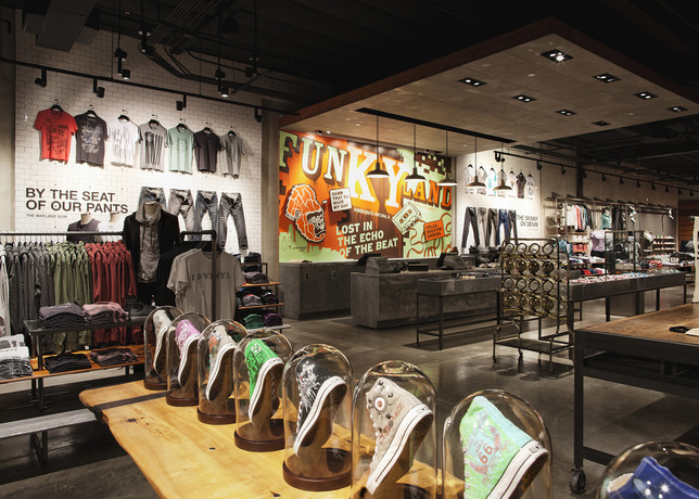 El diseño de la tienda evoca el espíritu imaginativo de California y habla directamente con el deporte de Converse y la herencia del rock ‘n roll. Tres grandes lucernarios llenan la tienda con luz natural. Una tienda con claro carácter industrial con colores suaves como el gris, la madera y el blanco que dejan el protagonismo a los grafismos de las paredes y al producto.