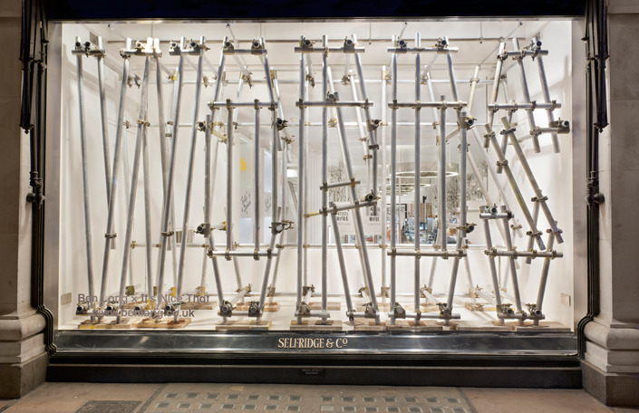 Los escaparates han sido diseñados por Ben Long, que ha realizado una interesante estructura de andamios, Giles Miller, que ha realizado un escaparate con letras en cartón y por último, Chrissie Macdonald, que ha aumentado las dimensiones de objetos cotidianos para crear una imagen surrealista.