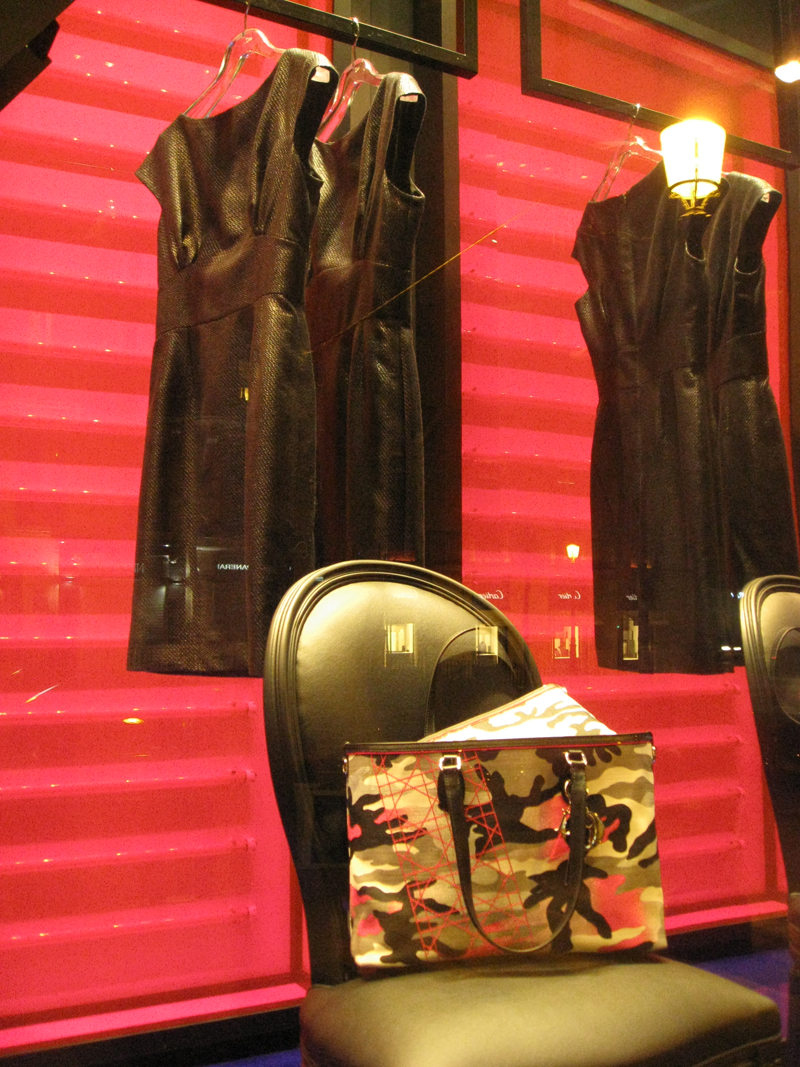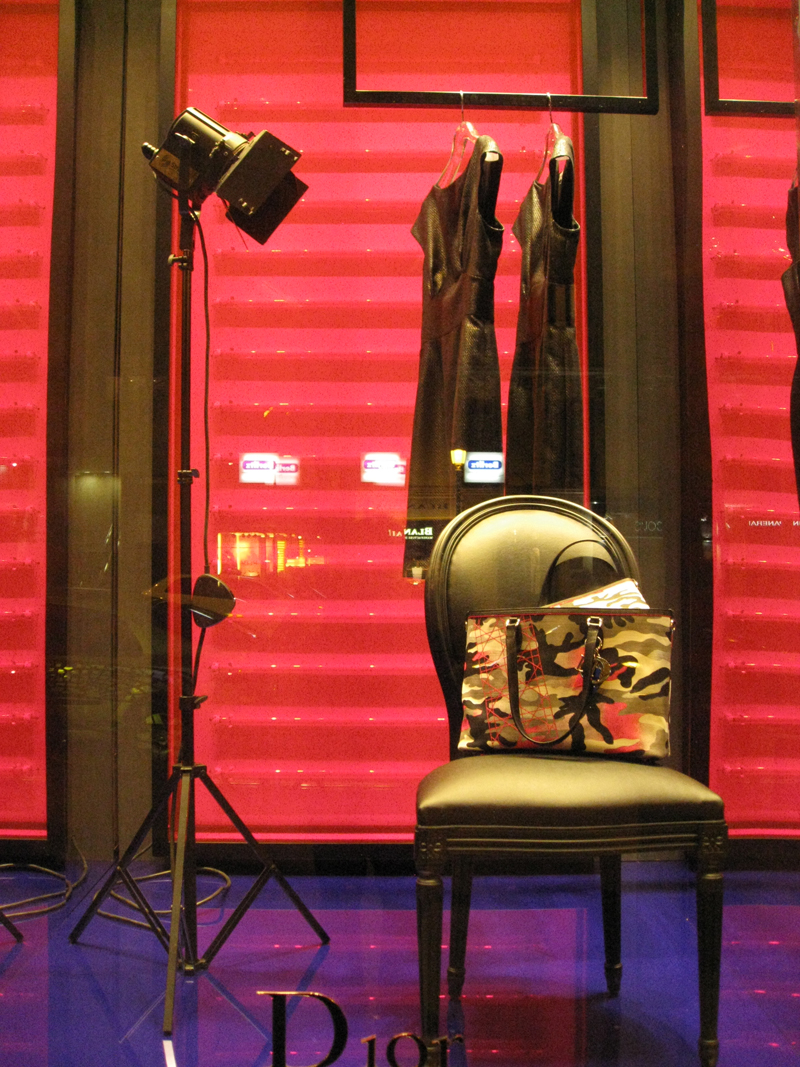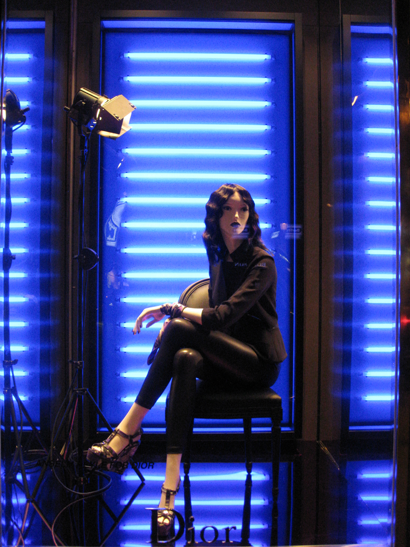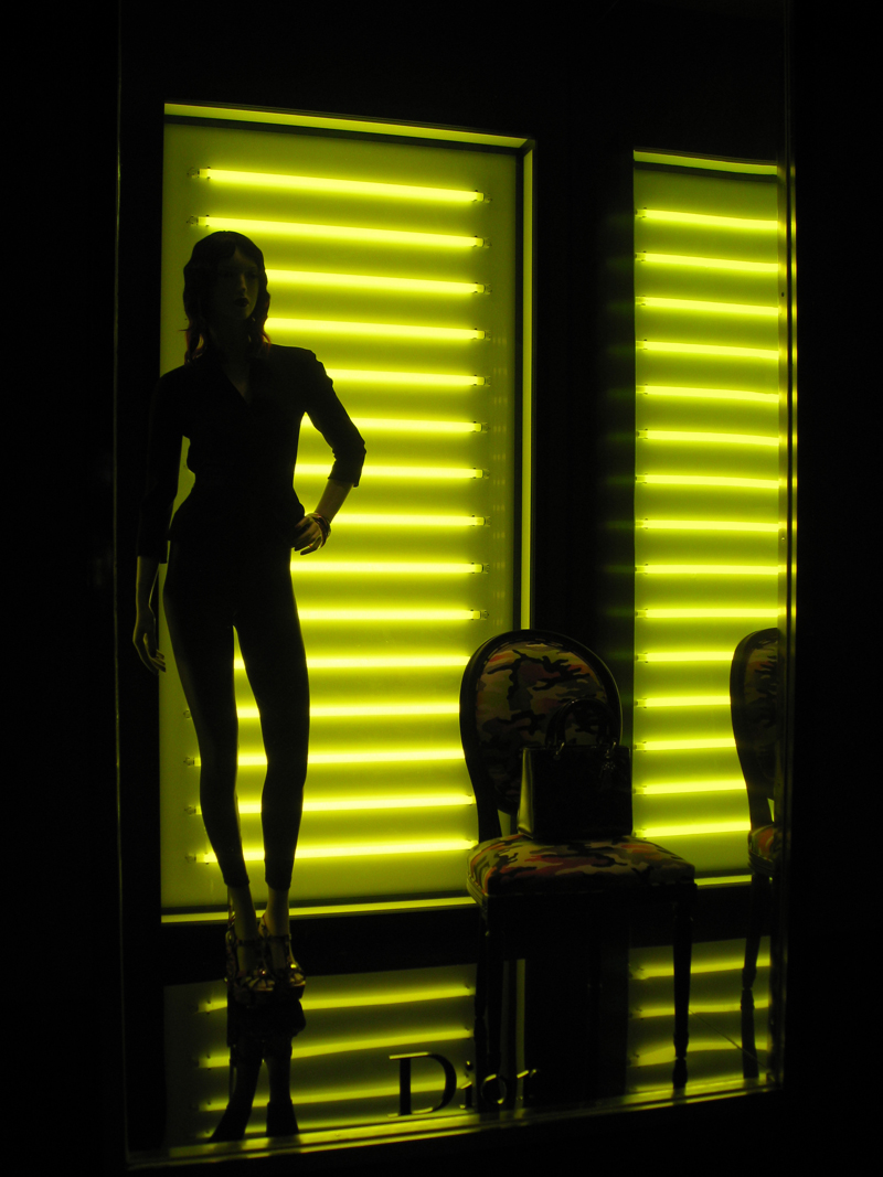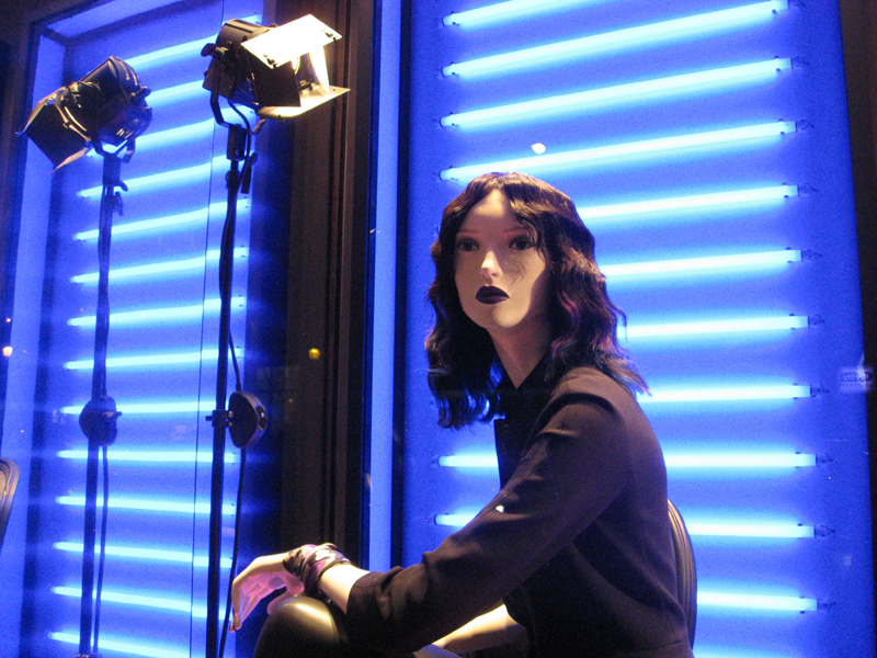 Tubos fluorescentes en amarillo, rojo y azul para el fondo del escaparate. Por delante de estos, los maniquíes y unos pocos elementos, como una silla, un foco y un perchero.