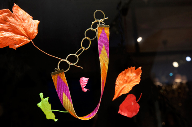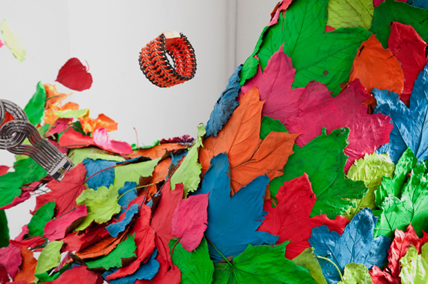 Hojas de colores neón se arremolinan en la vitrina para conformar un vestido otoñal, en esta temporada navideña que empieza. En el video puedes ver parte del proceso de trabajo y la opinión de los creadores.