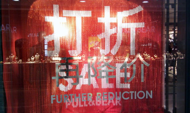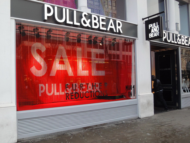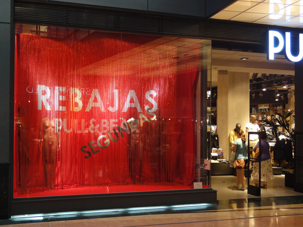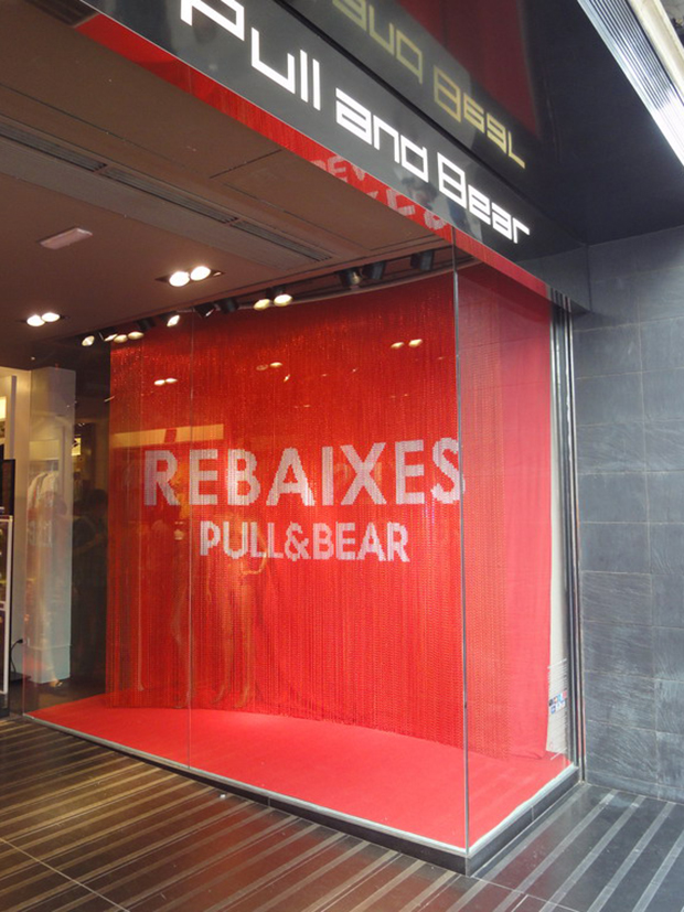 KriskaDECOR viene confeccionando estas cortinas personalizadas para Pull & Bear desde el Verano de 2011. El diseño incluye la palabra Rebajas en cada idioma y el logotipo de Pull & Bear en color plata brillante sobre un fondo de color rojo.